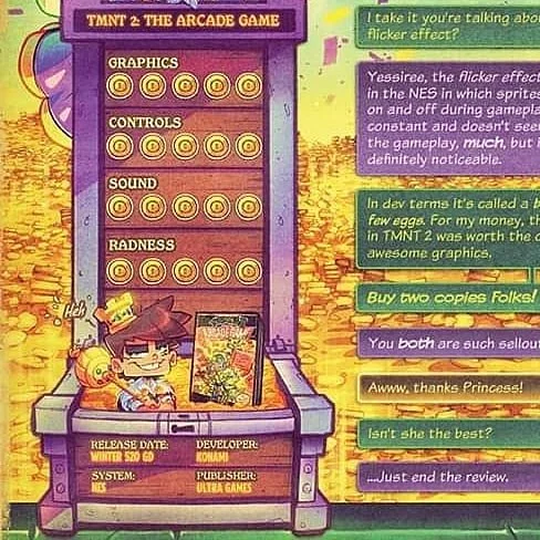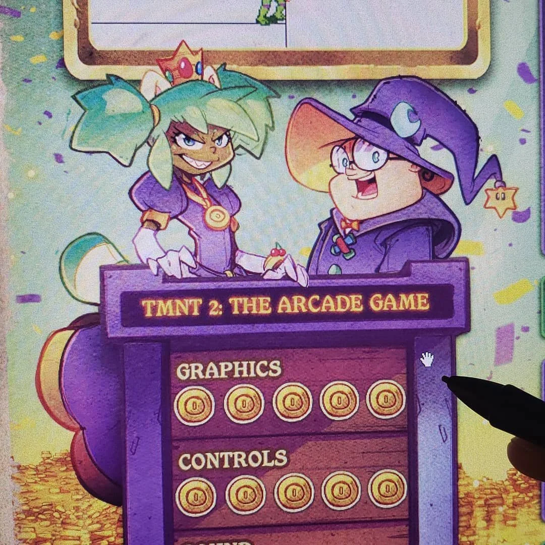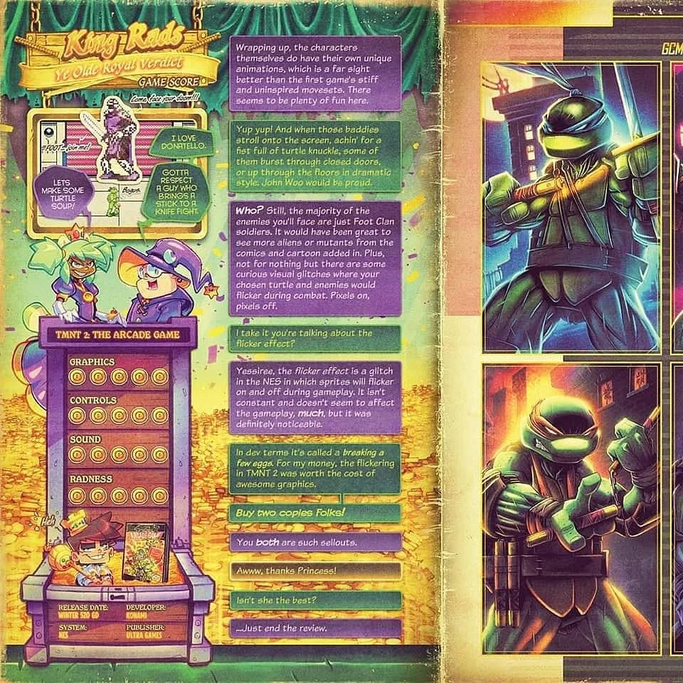 Work-in-progress image from Game Cave Magazine, a personal project by Sketchcraft. Features fictional characters reviewing TMNT 2: The Arcade Game on the NES, with a whimsical fantasy-themed interface and hand-drawn digital elements.
